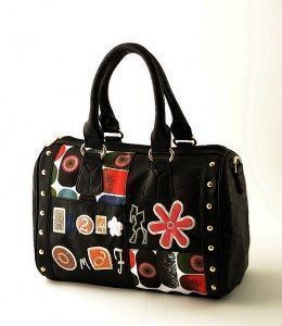 Sac à main nOir italien synthétique, mOtifs colOrés en relief, clOuté sur côtés, deux anses rigides, intérieur dOublé.